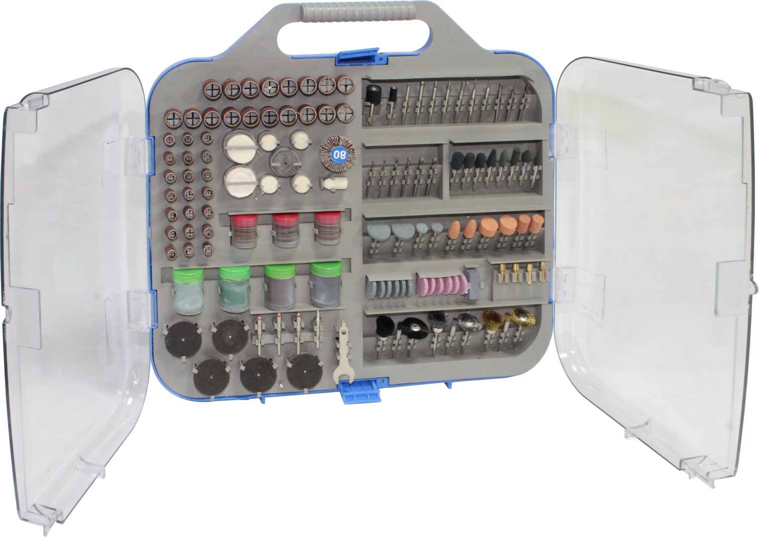 39un. Fita de Lixa» 1/4" x 1/2", 1/2" x 1/2"; 5un. Discos de Polir » 1/2" x 1/4", 1" x 1/4"; 1un. Ponta de Polir »3/8" x 3/4"; 1un. Disco de Pano » 1" x 1/8"; 1un. Disco de Esmerilar »7/8" x 5/32"; 1un. Disco de Lamelas »1-1/4" x 3/8"; 60un. Discos d