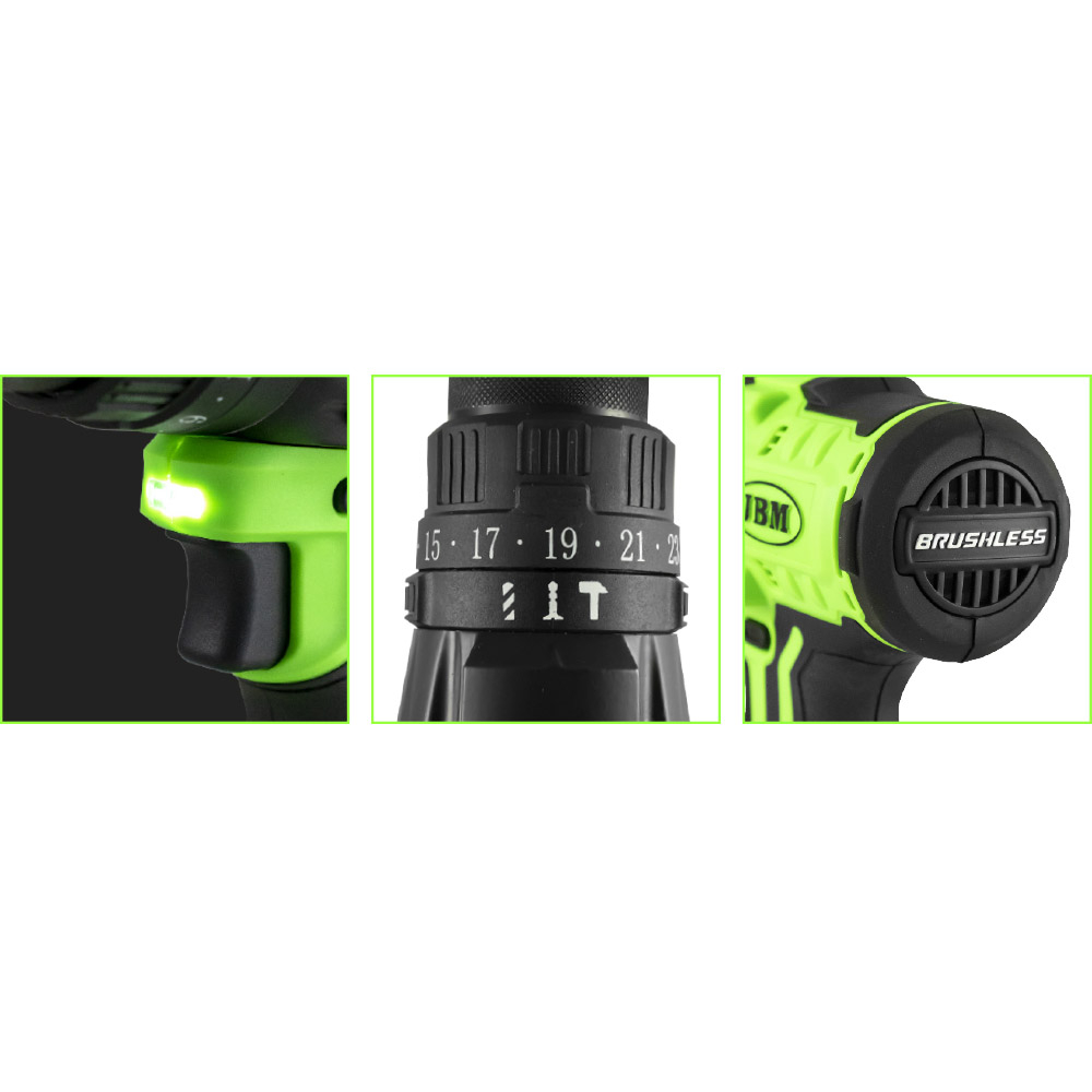 • Ferramenta elétrica verde e preta com texto BRUSHLESS e marcações numéricas 15 a 21.