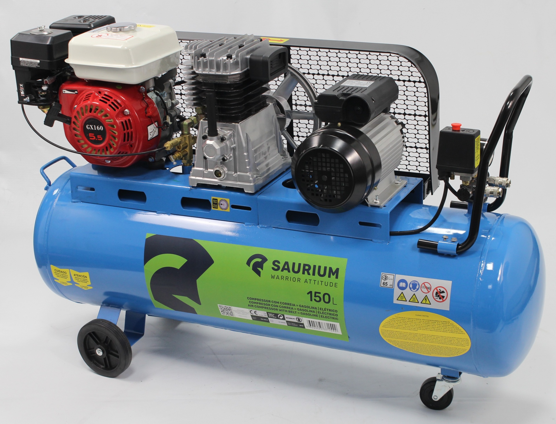 • Compressor de ar industrial azul SAURIUM 150L com motor vermelho e branco, proteção metálica e rodas