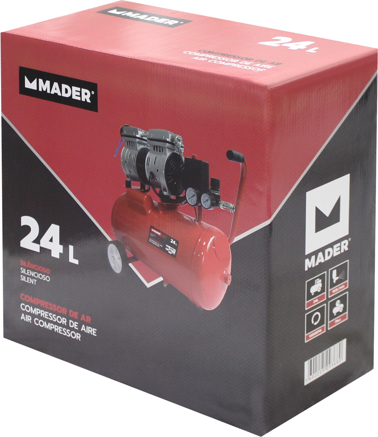 Compressor de Ar Silencioso, 24L, 0.75HP 128,00 € 140,00 € Desconto de %. Partilhar O produto encontra-se sem stock. Compressor de Ar Silencioso, 24L, 0.75HP REF: 09368 605 x 545 x 285 mmDepósito 24LPotência 0,75HP230V/50HzPressão 7 Bar - 102 PSIR.P.M. 1380 r.p.m.Ruido 81 dB EmbalagemAltura 60.00 cmLargura 60.00 cmComprimento 30.00 cmPeso Bruto 22.00 KgPeso Líquido 21.00 Kg Marca Mader Características