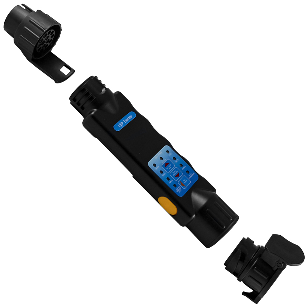 Este testador tem um soquete de 13 pinos em cada extremidade para ser conectado ao reboque e ao plugue do carro. Inclui um adaptador de 13 a 7 pinos.PILA 9V