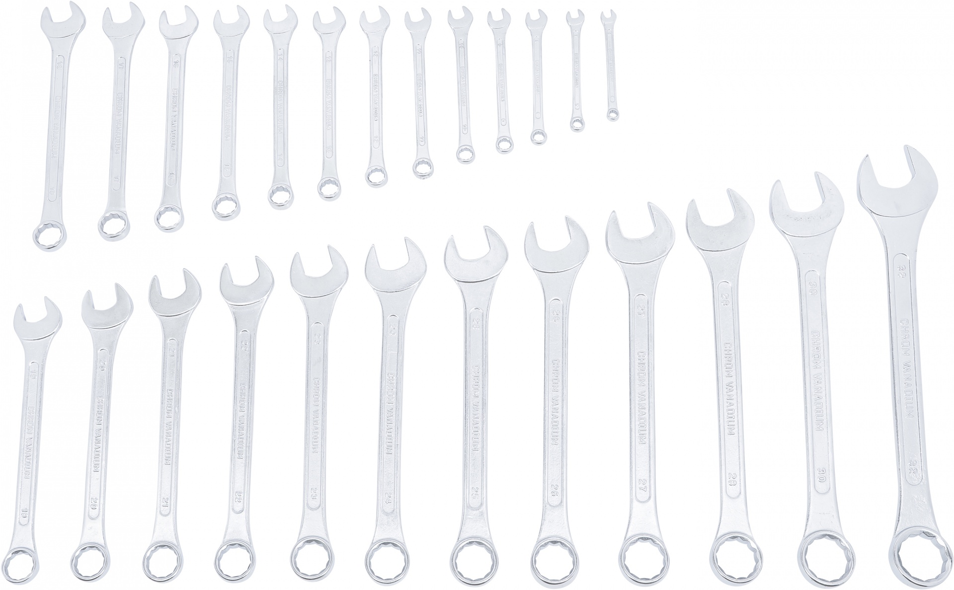 • Conjunto de chaves combinadas metálicas prateadas em duas linhas