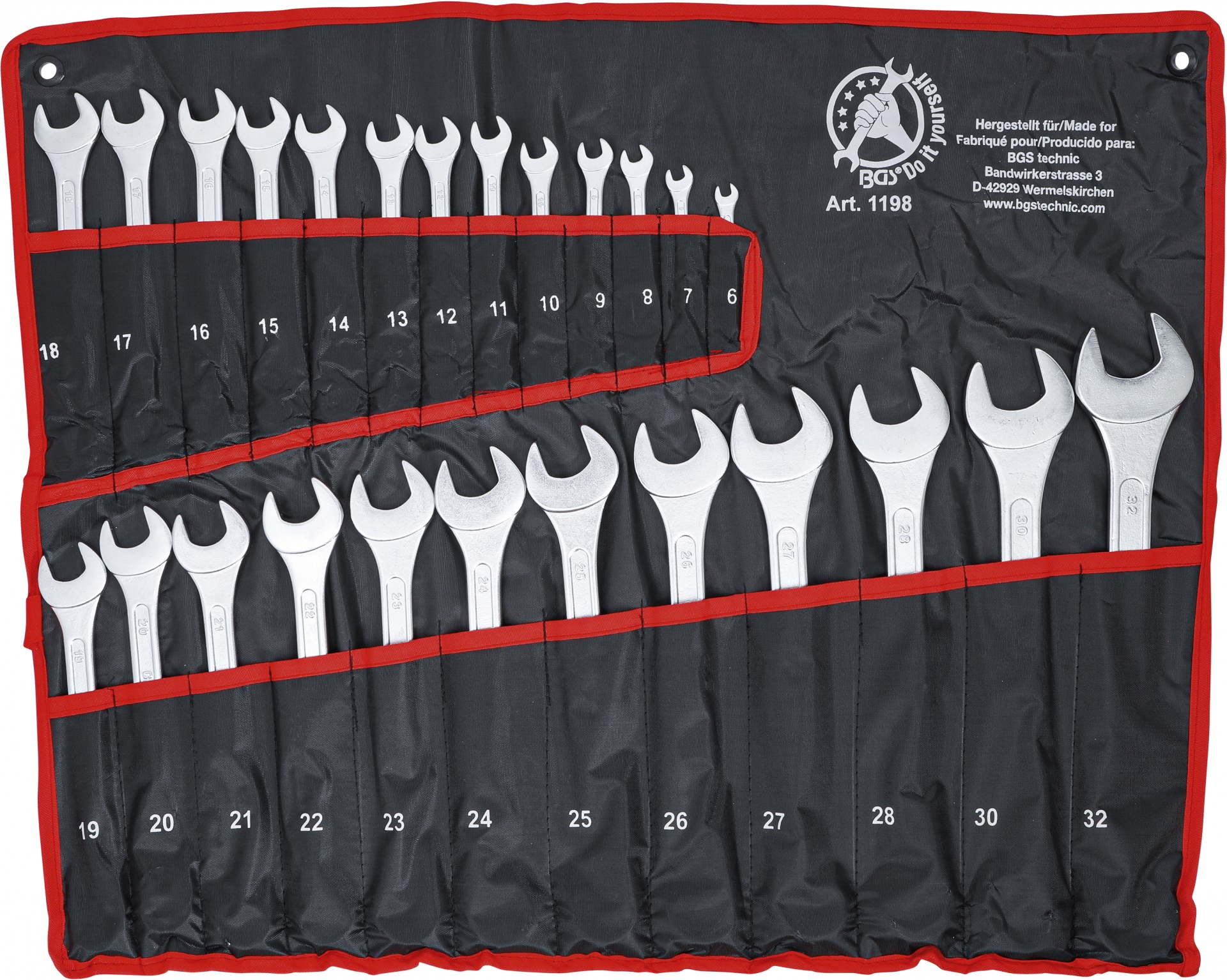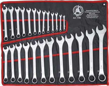 • Jogo de chaves inglesas em estojo de tecido preto com bordas vermelhas e texto branco