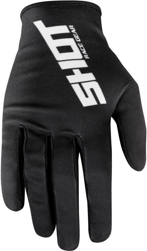 • Luva preta de tecido com texto branco SHOT RACE GEAR no dorso da mão