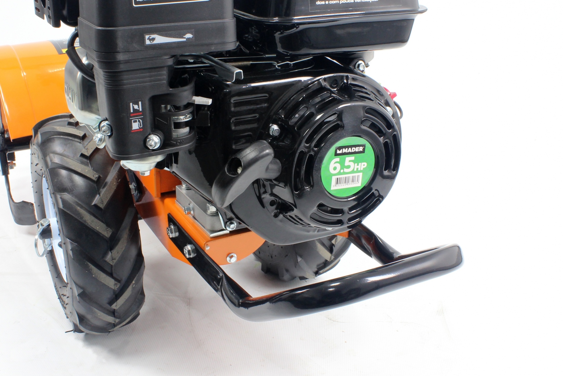 • Motor preto de 6,5 HP SKANDER em estrutura laranja com pneu preto