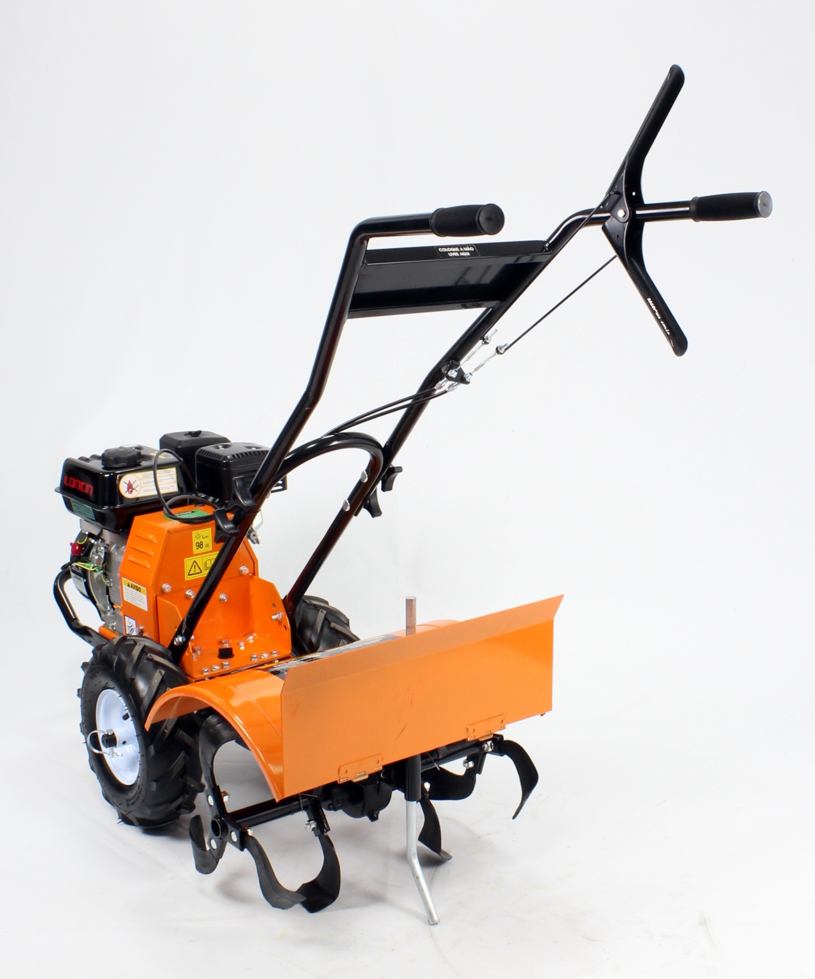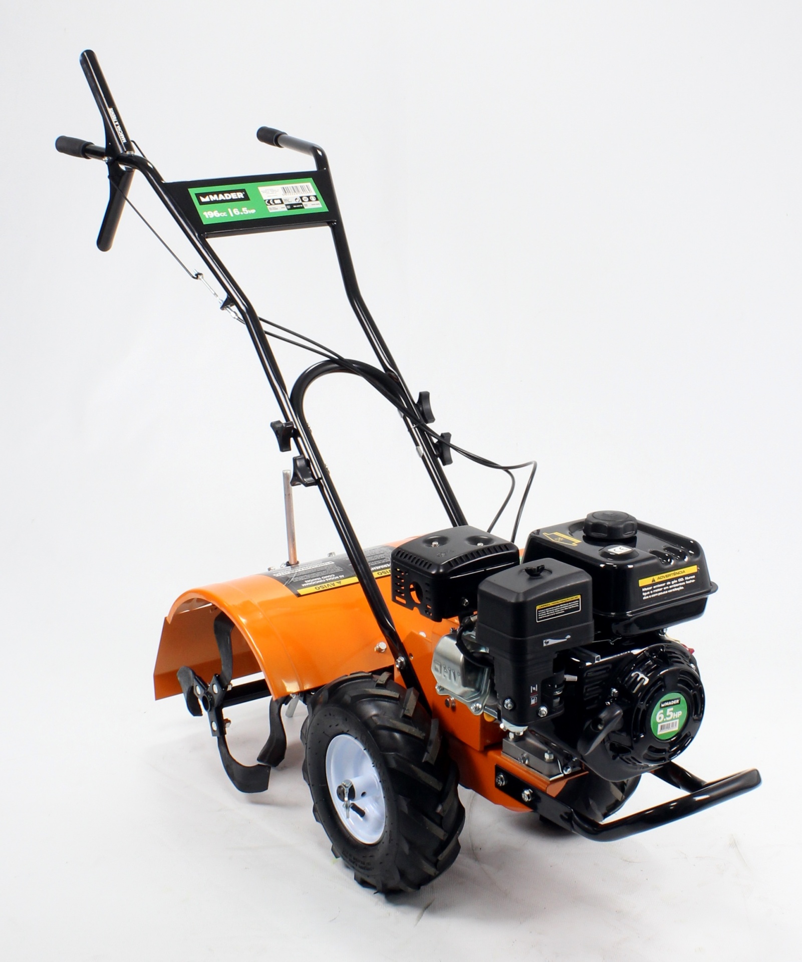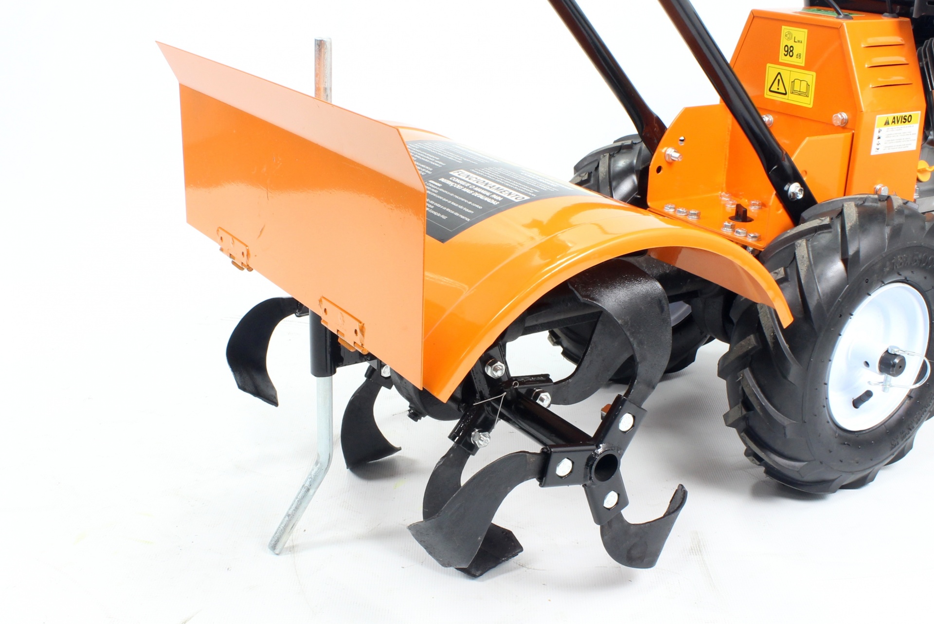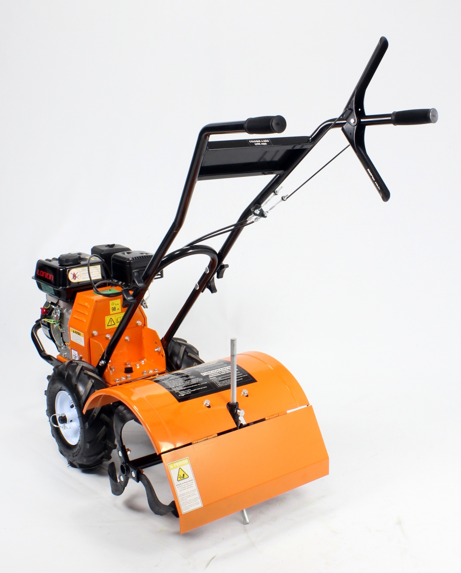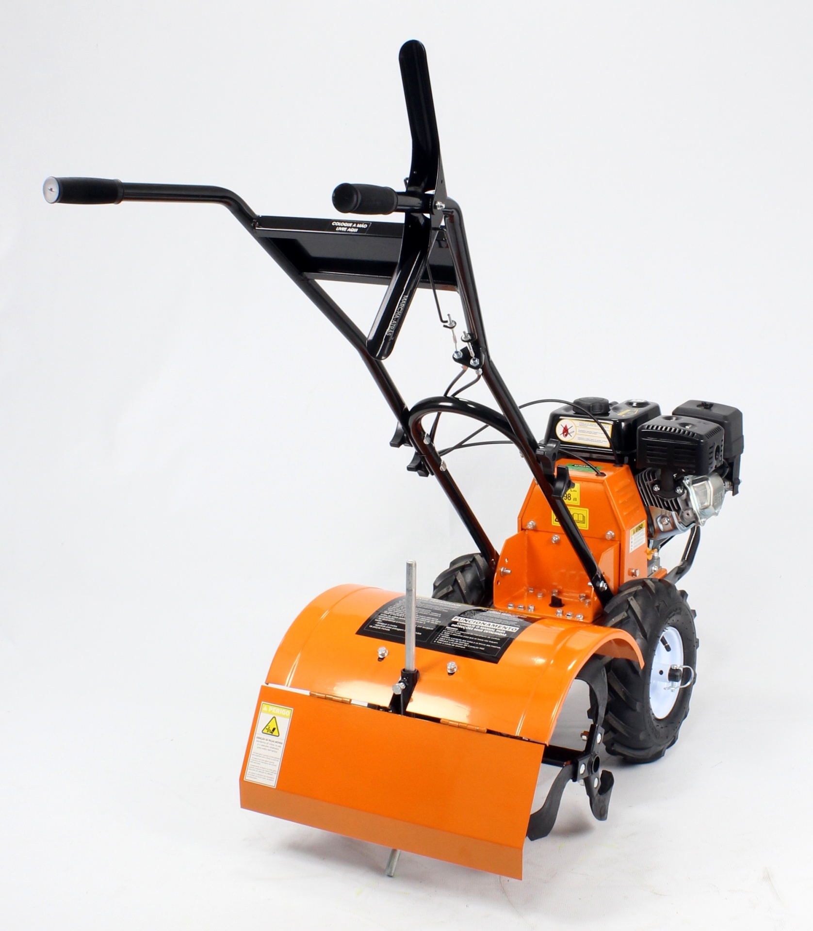 • Motoenxada laranja com motor e punhos pretos sobre fundo branco