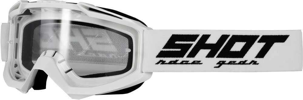 • Óculos motocross SHOT com fita branca e logótipo preto